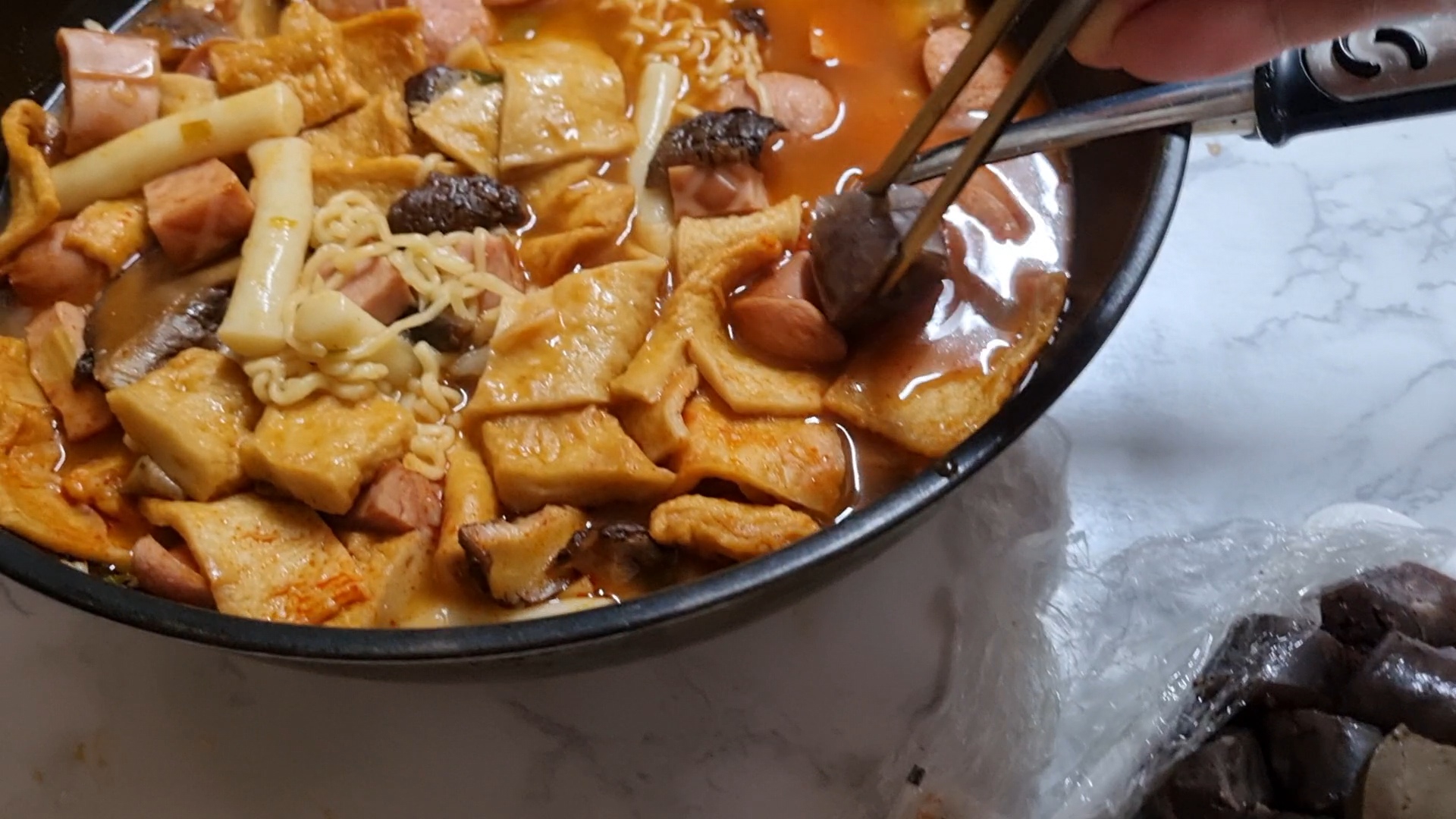 라볶이는 집에서 재료를 준비하여 직접 만들었데 순대와 함께 드시려면 떡볶이 국물을 조금 진하고 걸쭉하게 하면 더 맛있게 드실 수 있습니다.