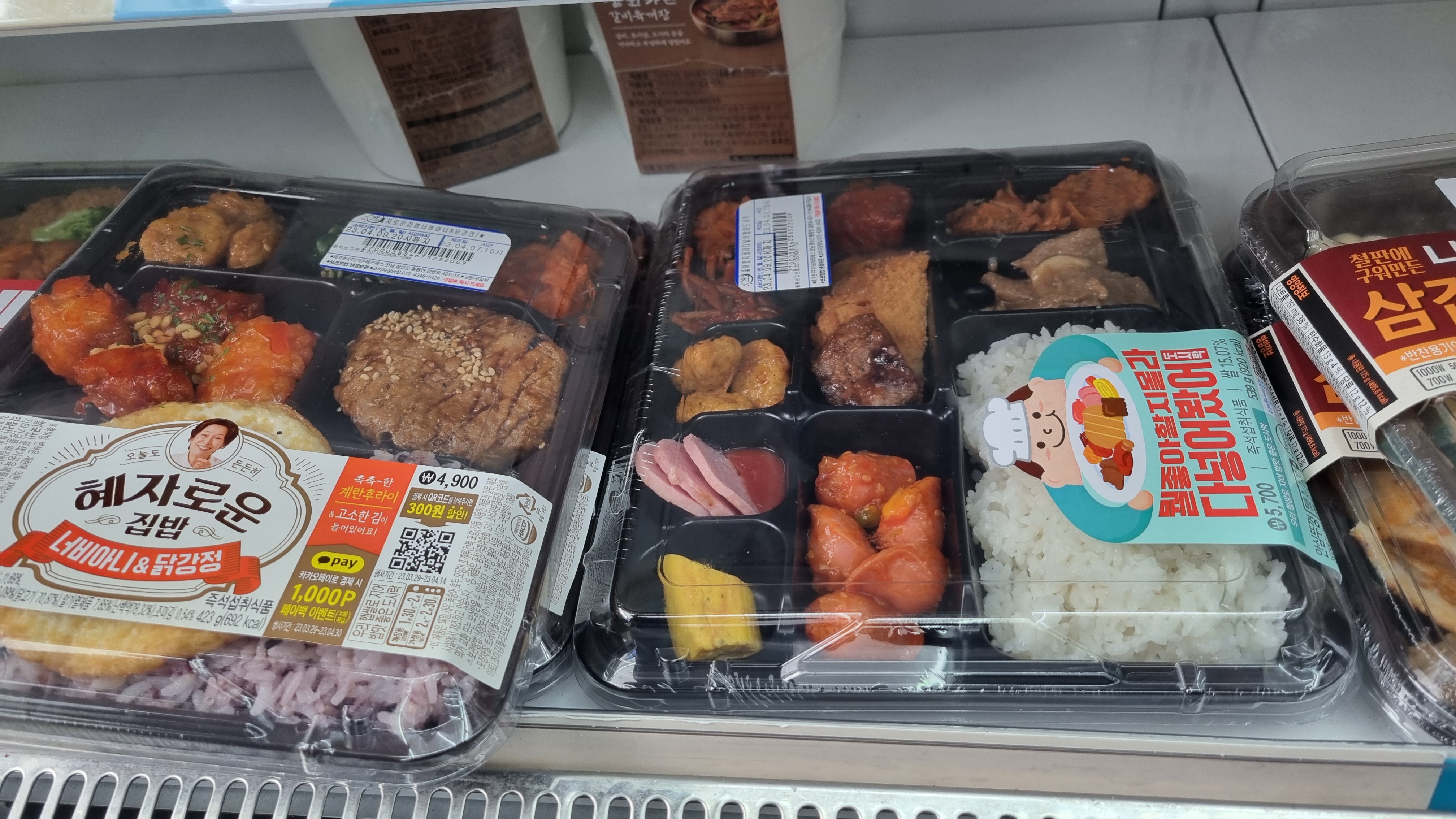 위의 도시락은 왼쪽이 4,900원이고 오른쪽 사진이 5,700원입니다. 구성은 일단 밥이 한공기 있고 소시지볶음, 김치, 닭강정, 돼지고기볶음, 갈비산적등 생각보다 다양하고 종류도 여러 가지입니다.