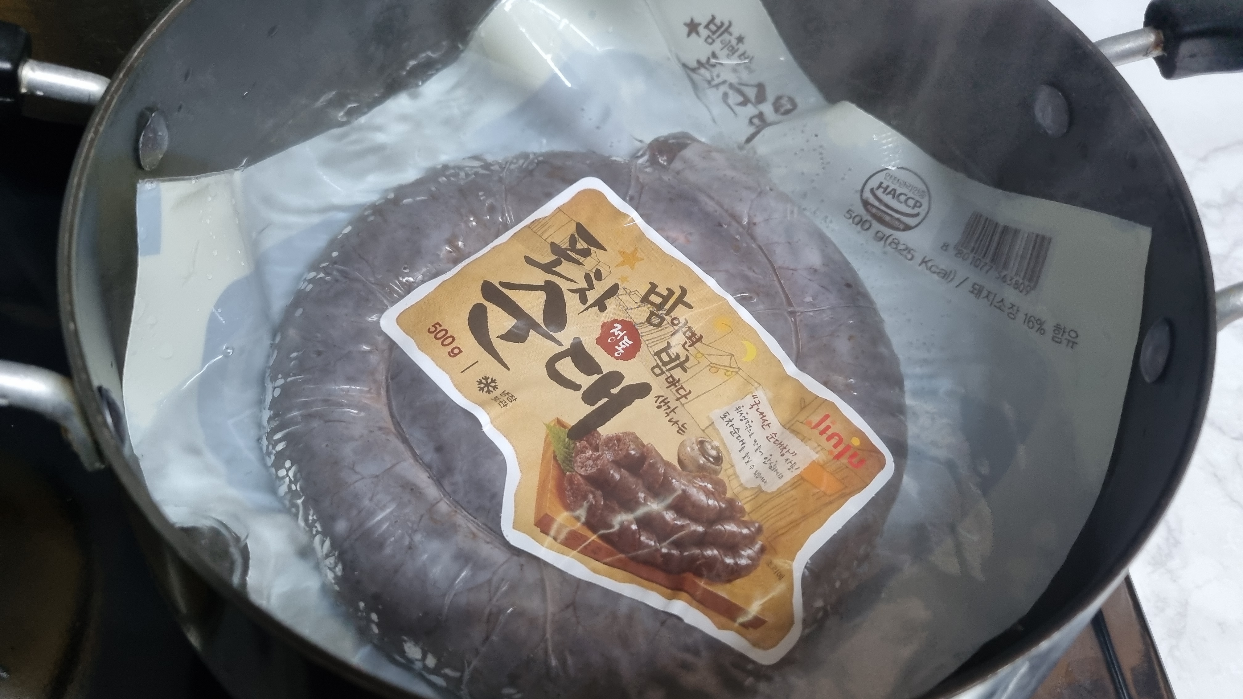 물을 미리 끓이고 포장순대를 넣은 방법도 있고 물과 함께 넣는 방법도 있는데 뒤면의 조리법에서는 물을끓인후 넣으라고 되어 있습니다.