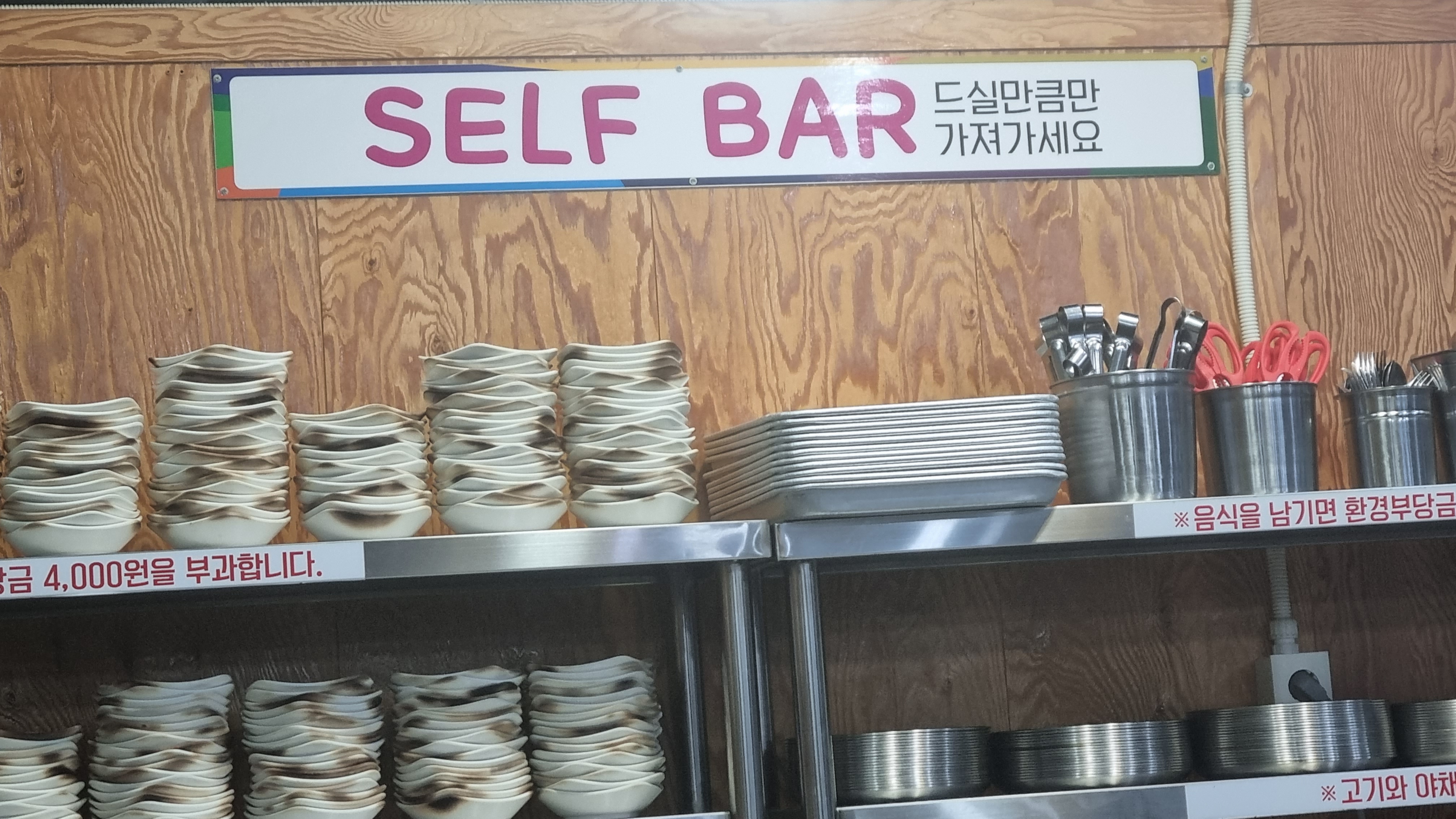 셀프바에 집게 그릇 접시등이 엄청 많이 준비되어 있고 이곳에서 고기나 각종음식을 원하는 만큼 가져가시면 됩니다. 복잡하지도 않고 넓어 이용하기 편리합니다.