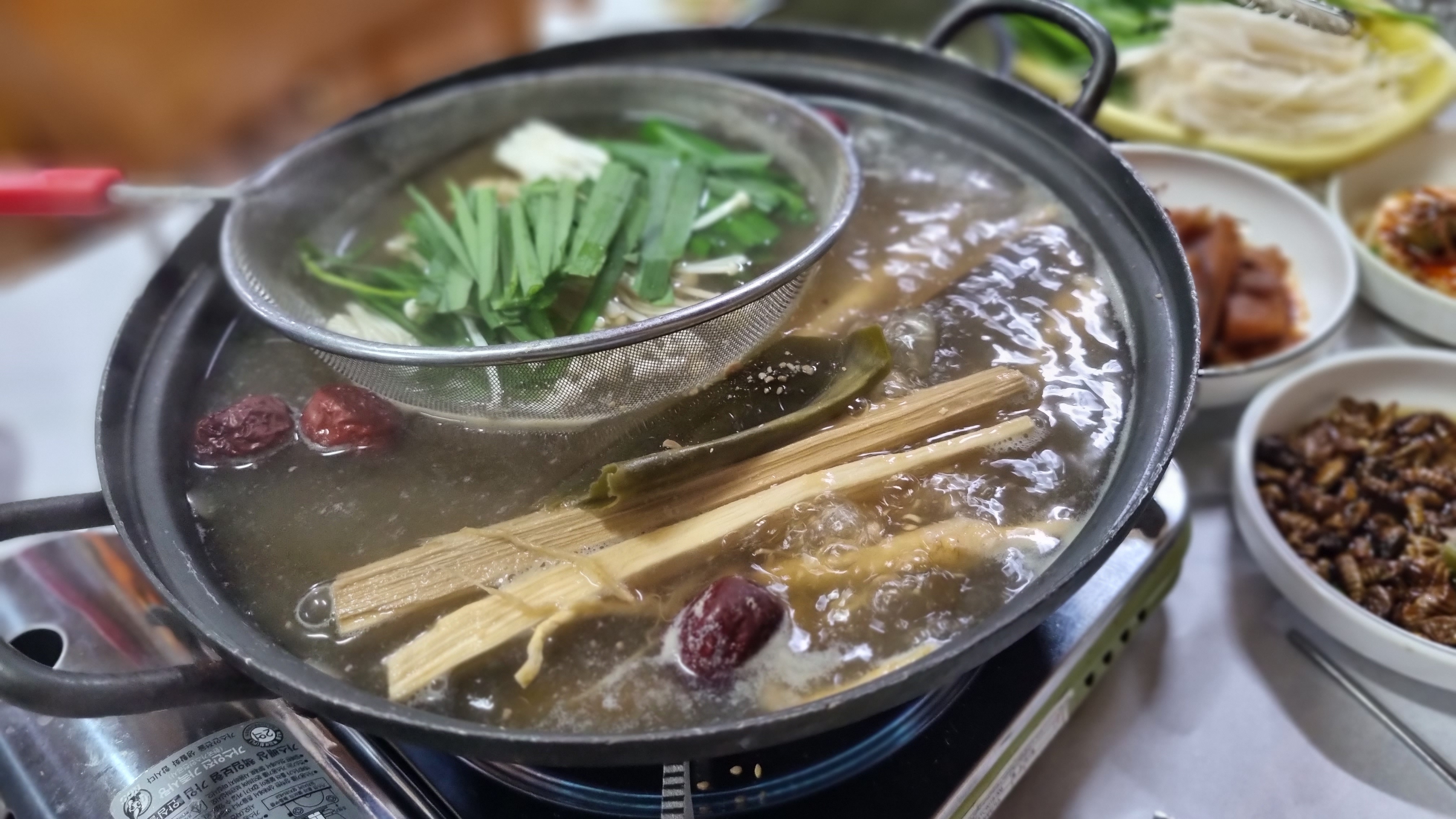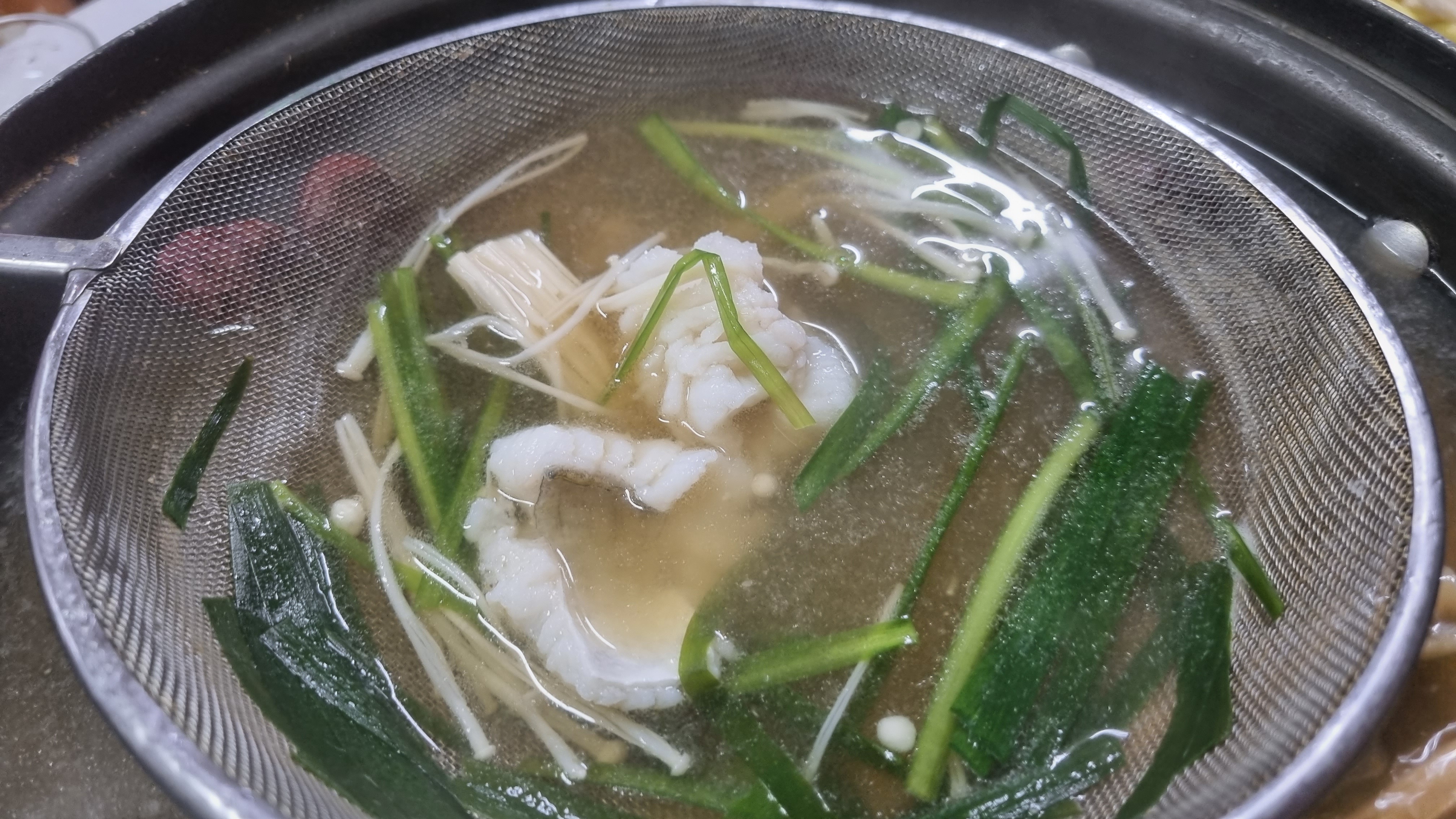 육수냄비에 별도 체망을 올려 그곳에 갯장어를 살짝 담가 드시면 됩니다. 육수에 담그는 시간은 10초가 적당하는데 더 맛있게 먹고 싶으면 5초만 담그어 먹는 것이 쫄깃하고 맛있었습니다.
