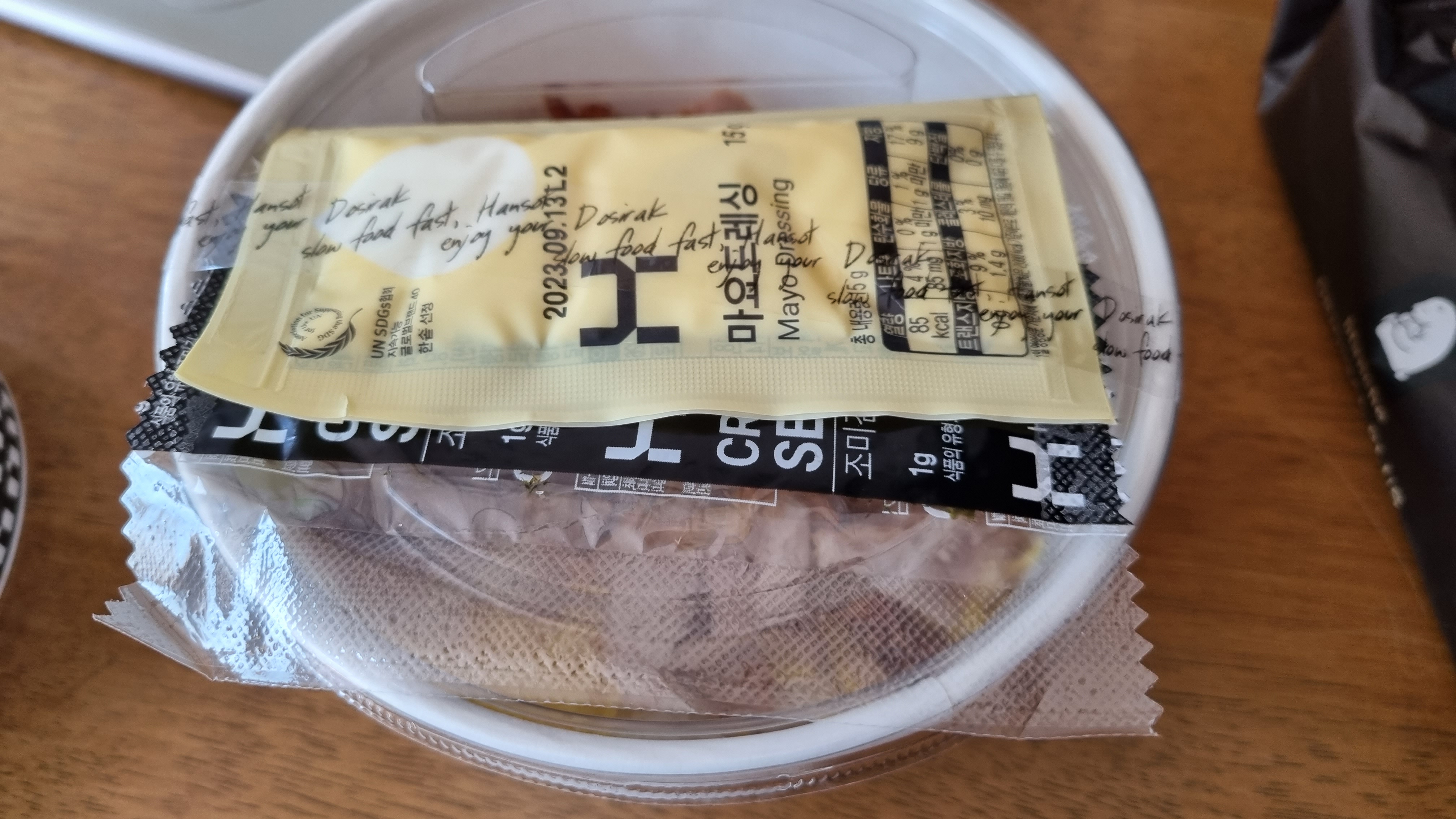 왼쪽에 있는 것이 치즈 닭갈비 덮밥이며 오른쪽 사진이 치킨마요이며 일부 소스는 별도로 포장되어 있습니다