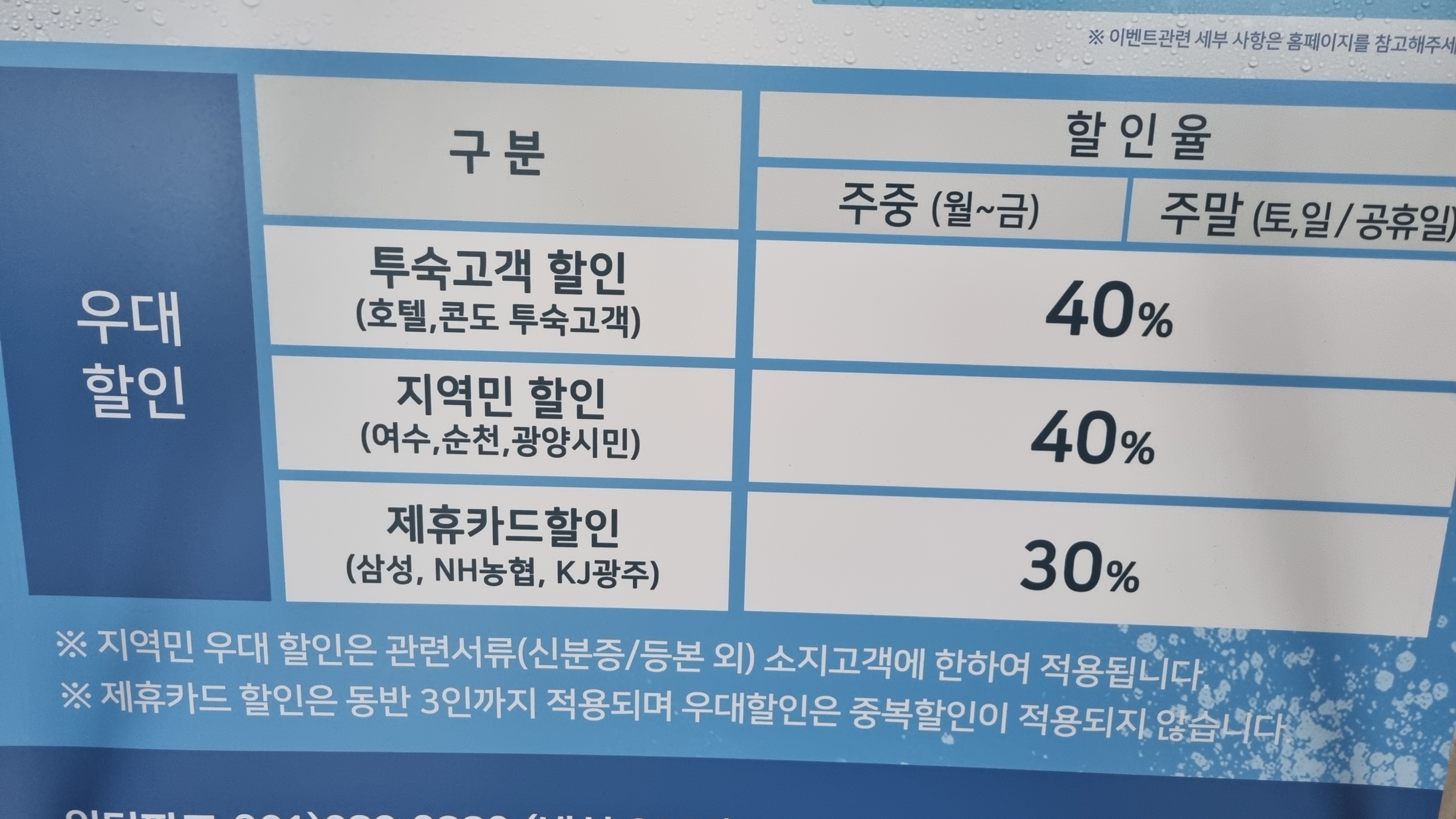 이어 일반인은 제휴할인카드를 적용하여 30%까지 동반 3인인 할인 받을 수 있는데 카드 종류는 삼성, NH농협, KJ광주카드면 가능하겠습니다.