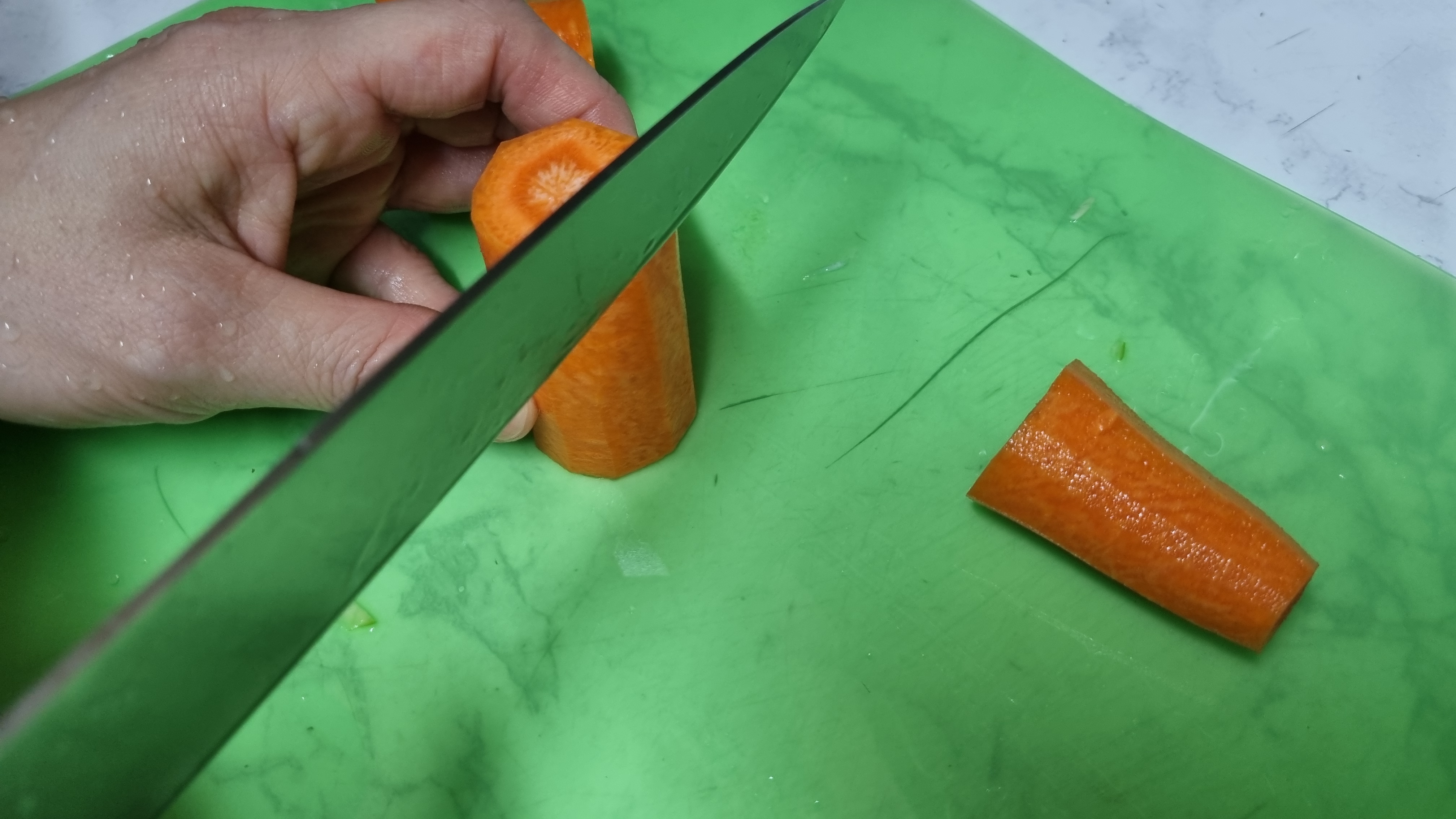 당근의 양은 약간 많고 적어도 상관이 없으며 한개 이내에서 집에 남아 있는 것을 조금 사용하면 됩니다. 썰을 때는 위의 사진처럼 길고 얇게 썰어야 합니다.