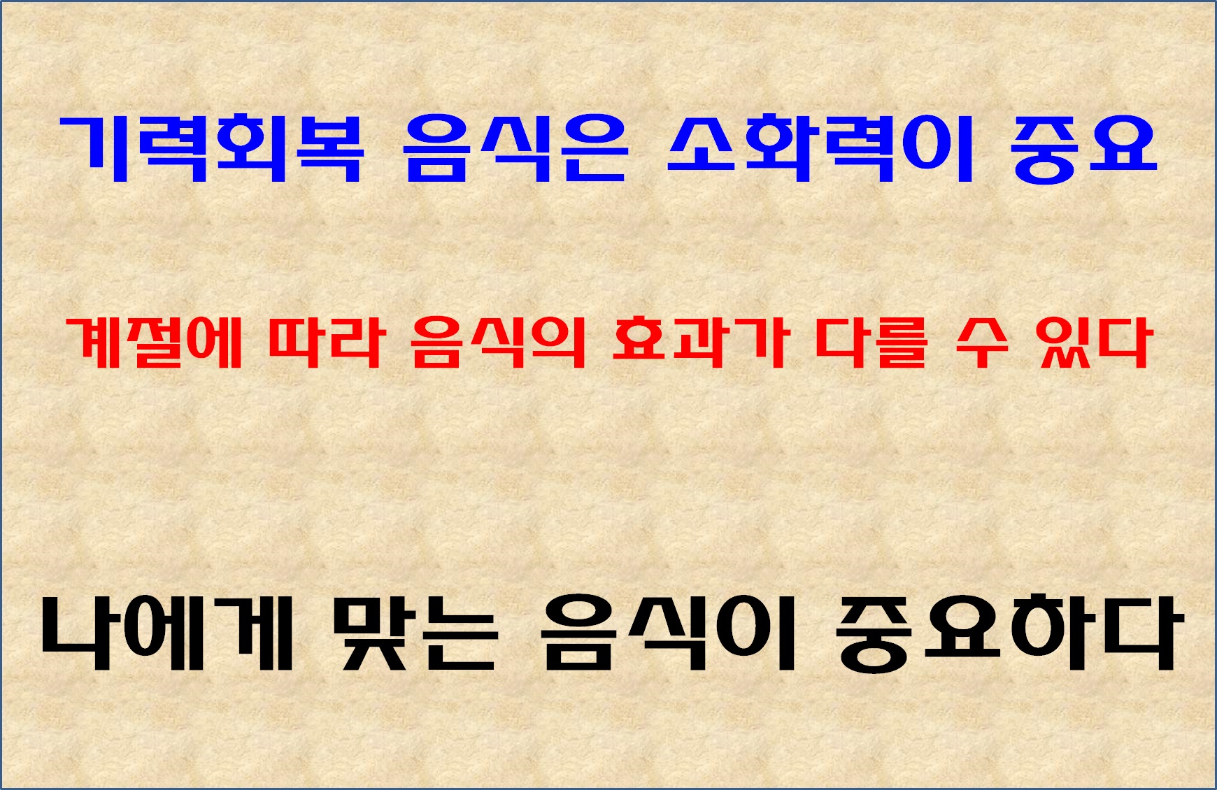 일을 많이 하거나 몸이 아픈 후 우리는 흔히 기운이 많이 약해적 거나 기력이 떨어졌다고 합니다. 이렇때 흔히 보약을 먹어야 하거나 푹 쉬어주는 것이 좋은 거다 생각하는데 여건상 푹 쉬는 것이 힘들 때 보약을 먹거나 좋은 음식을 먹어 회복해야 합니다.