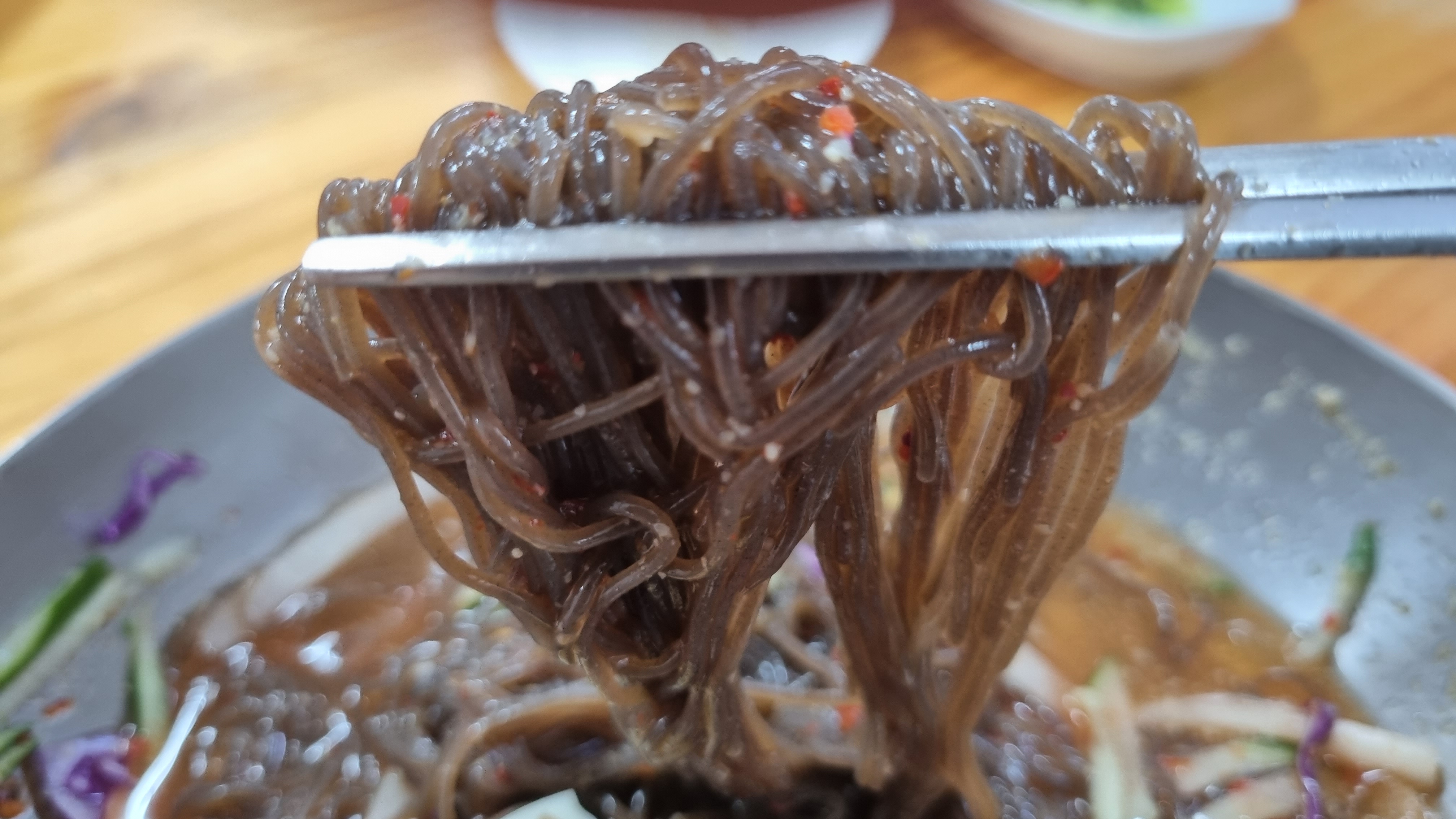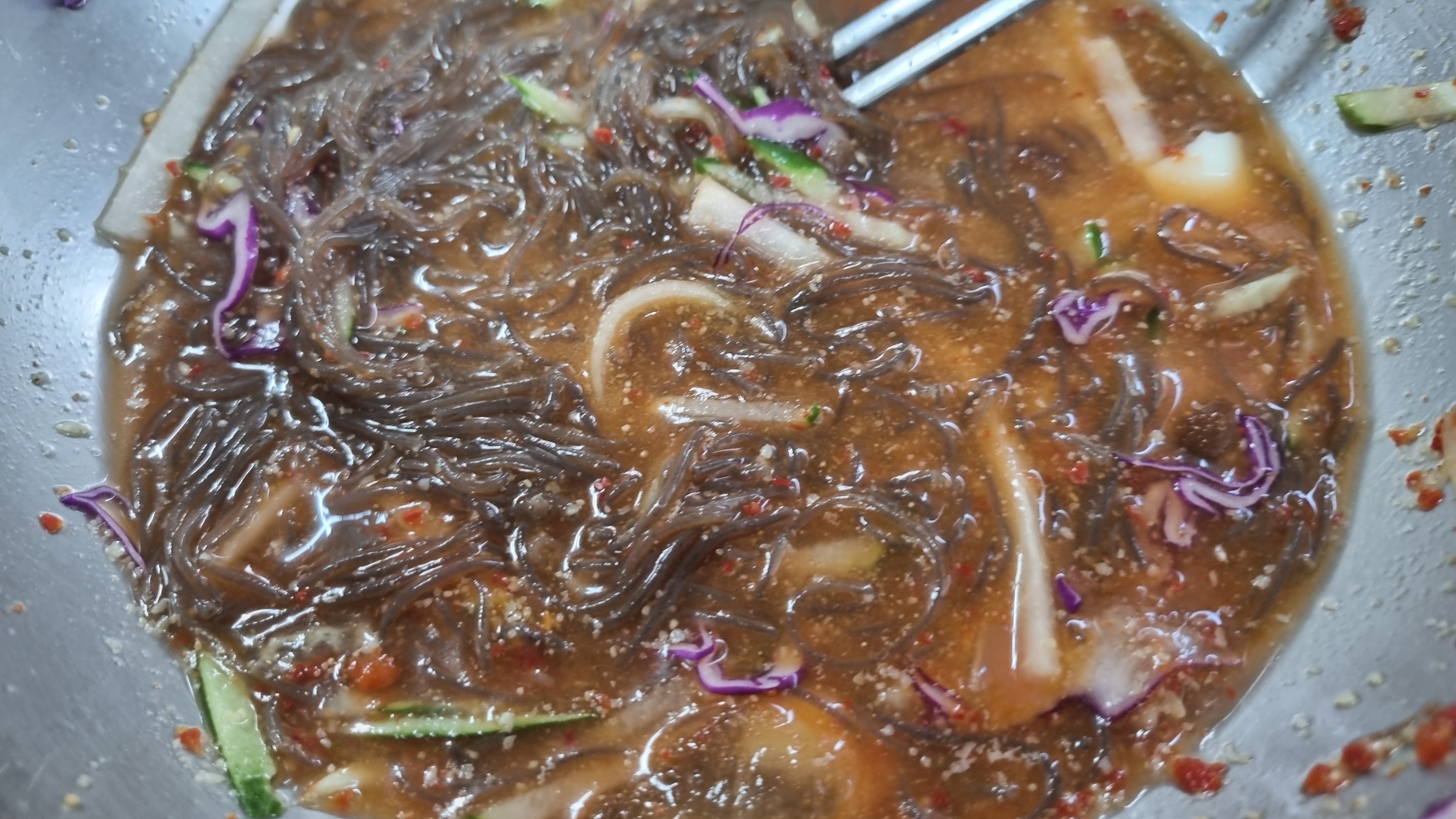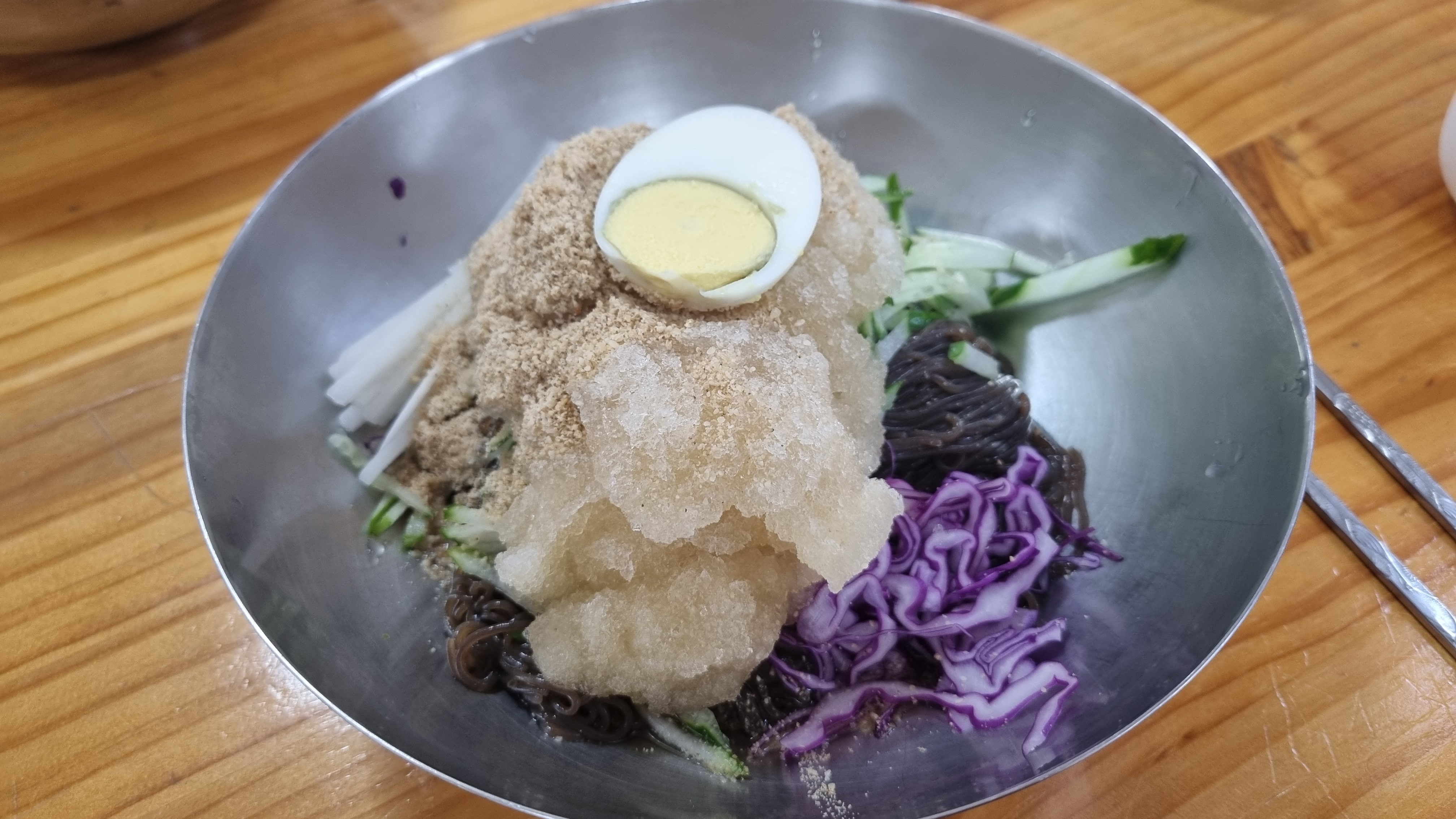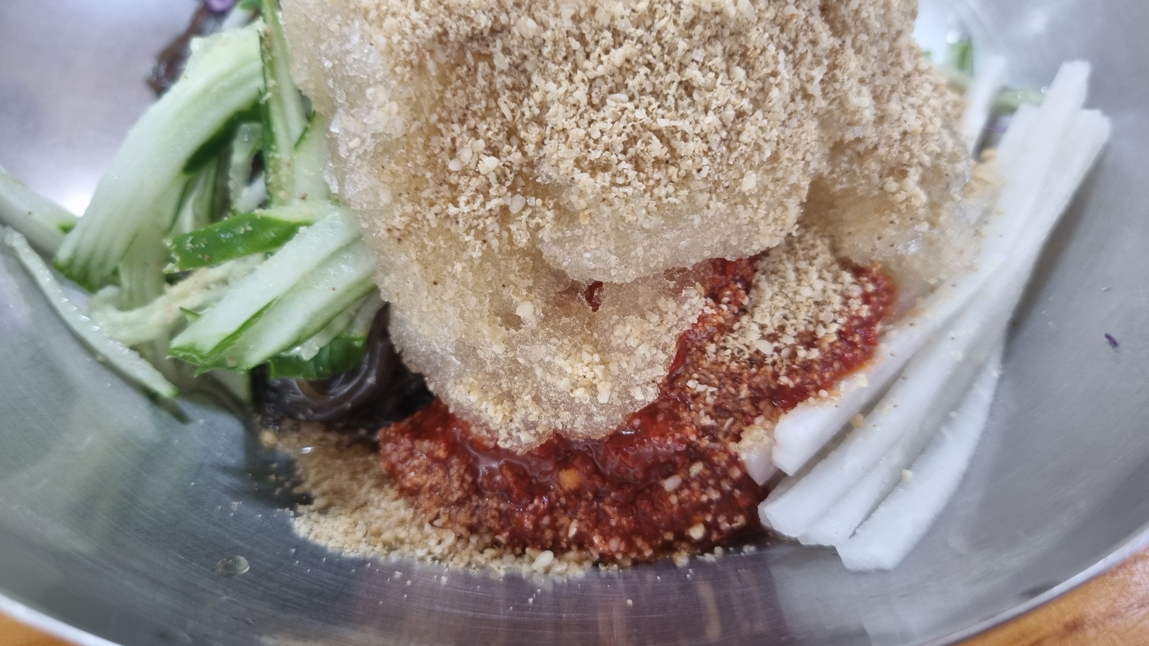 이것이 소문난 냉면입니다. 칡면발로 되어 있으며 살얼음과 오이 적색양배추 양념장 그리고 들깨가루가 조금 있는 듯합니다.