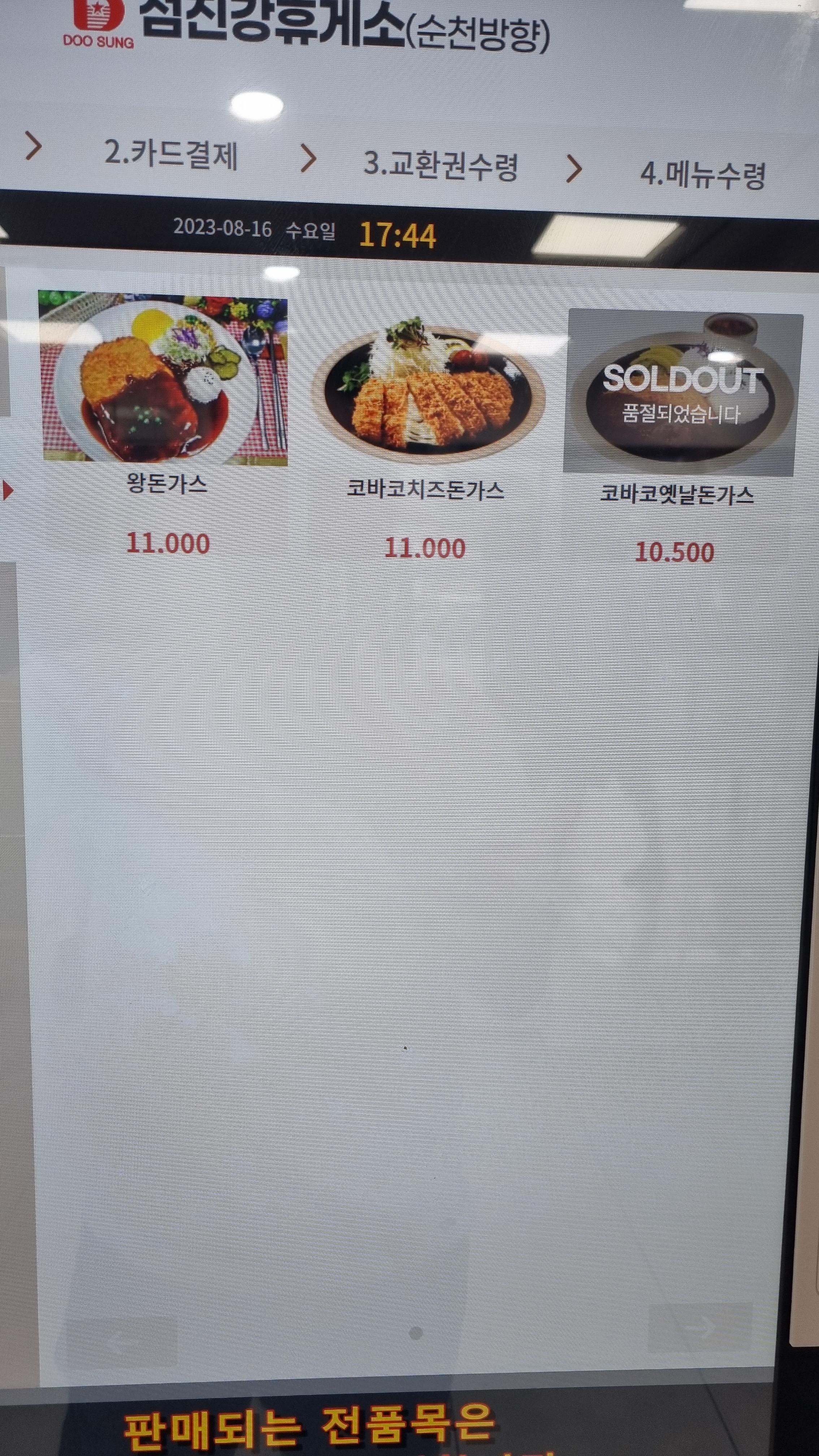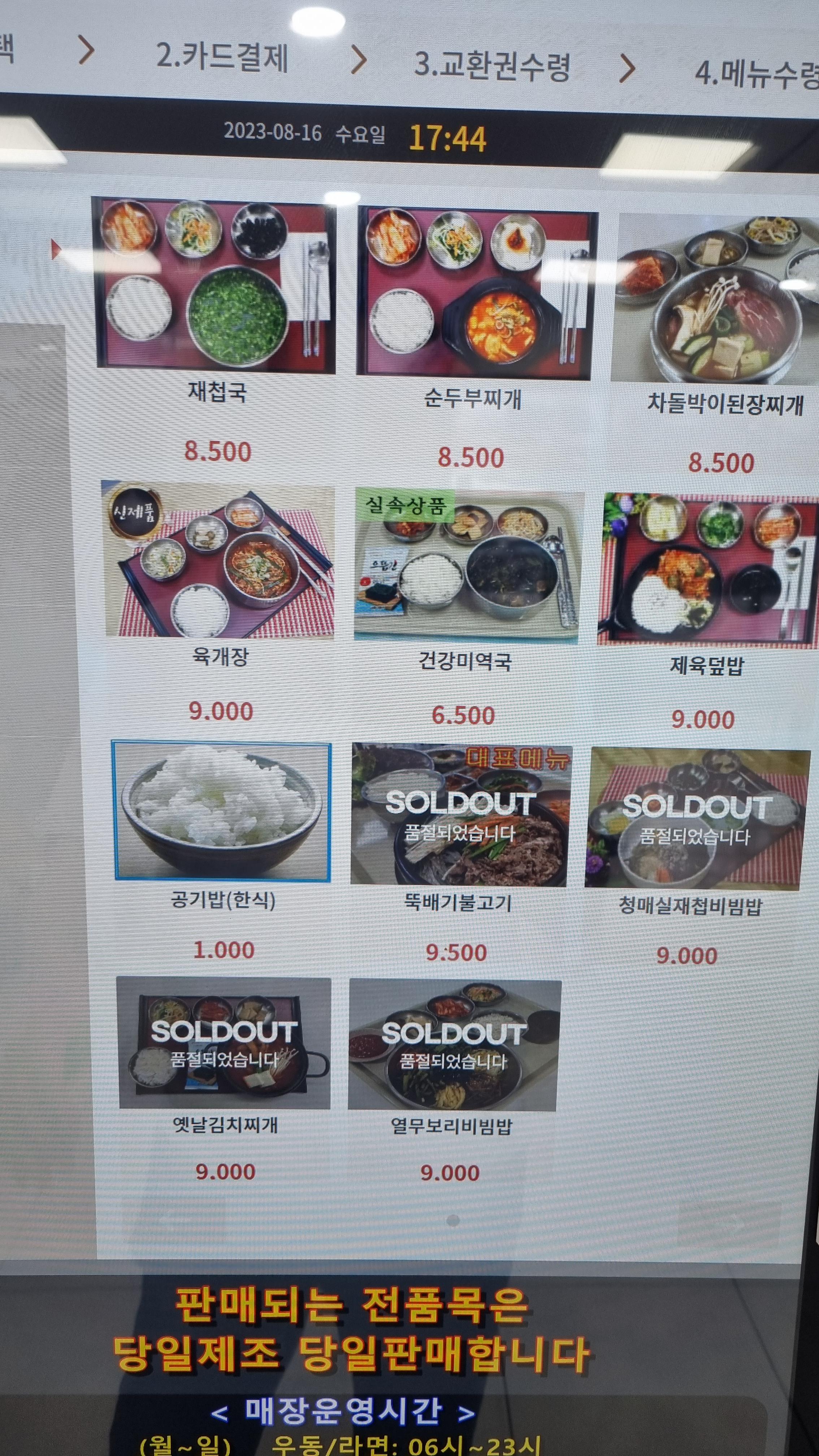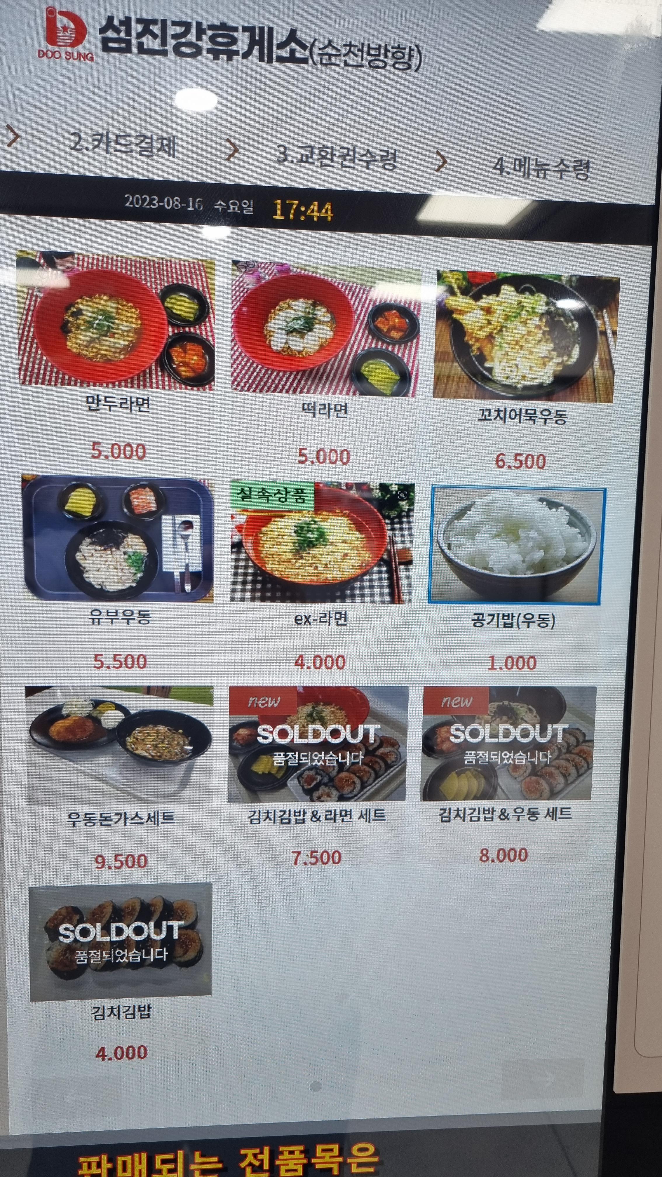 분식메뉴도 여러 종류가 있는데 떡라면, 만두라면, 꼬치어묵우동, 김밥등이 있는데 당일 모두판매되어 재료가 소진된 것은 별도포 표시되어 있습니다.