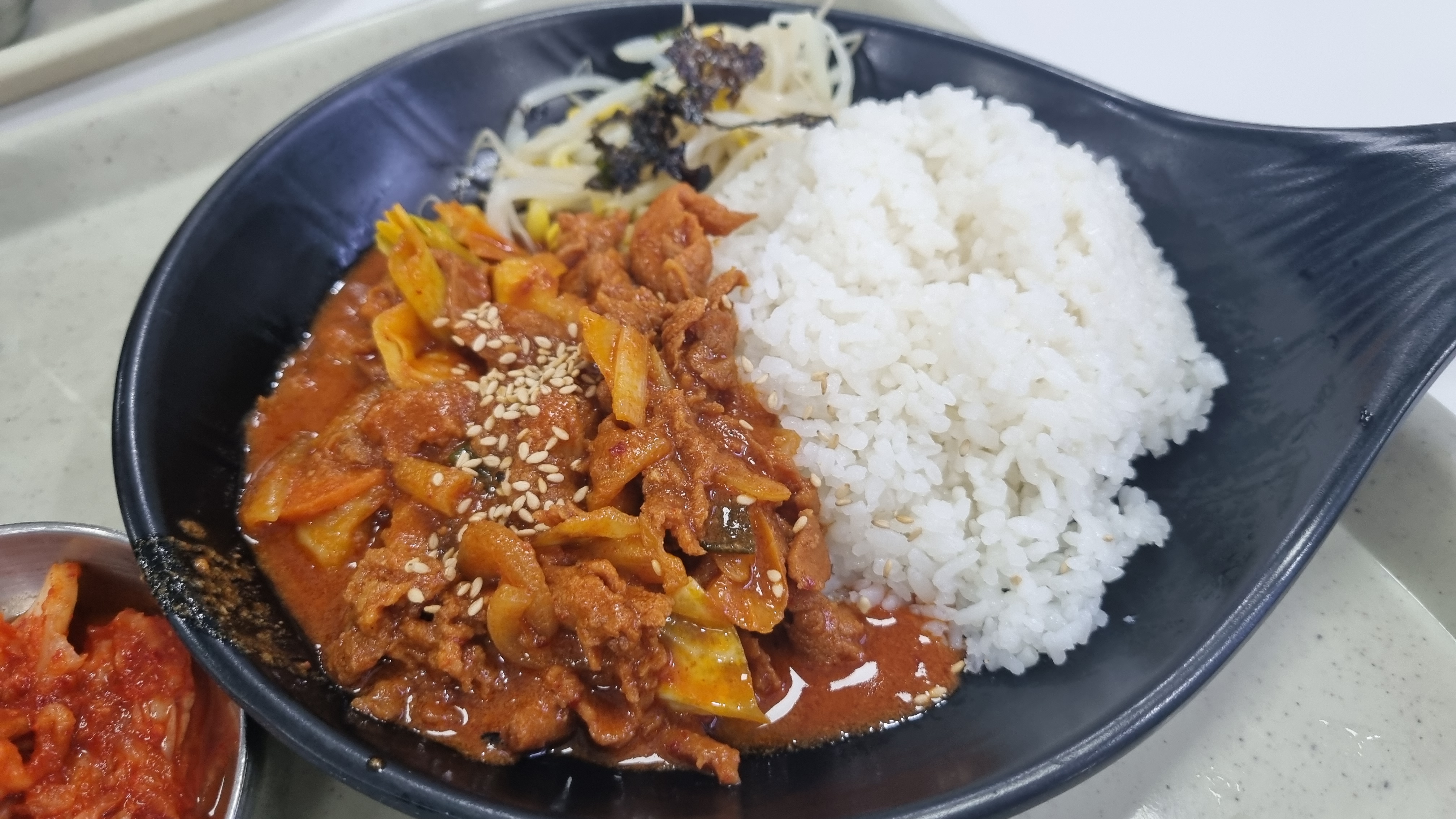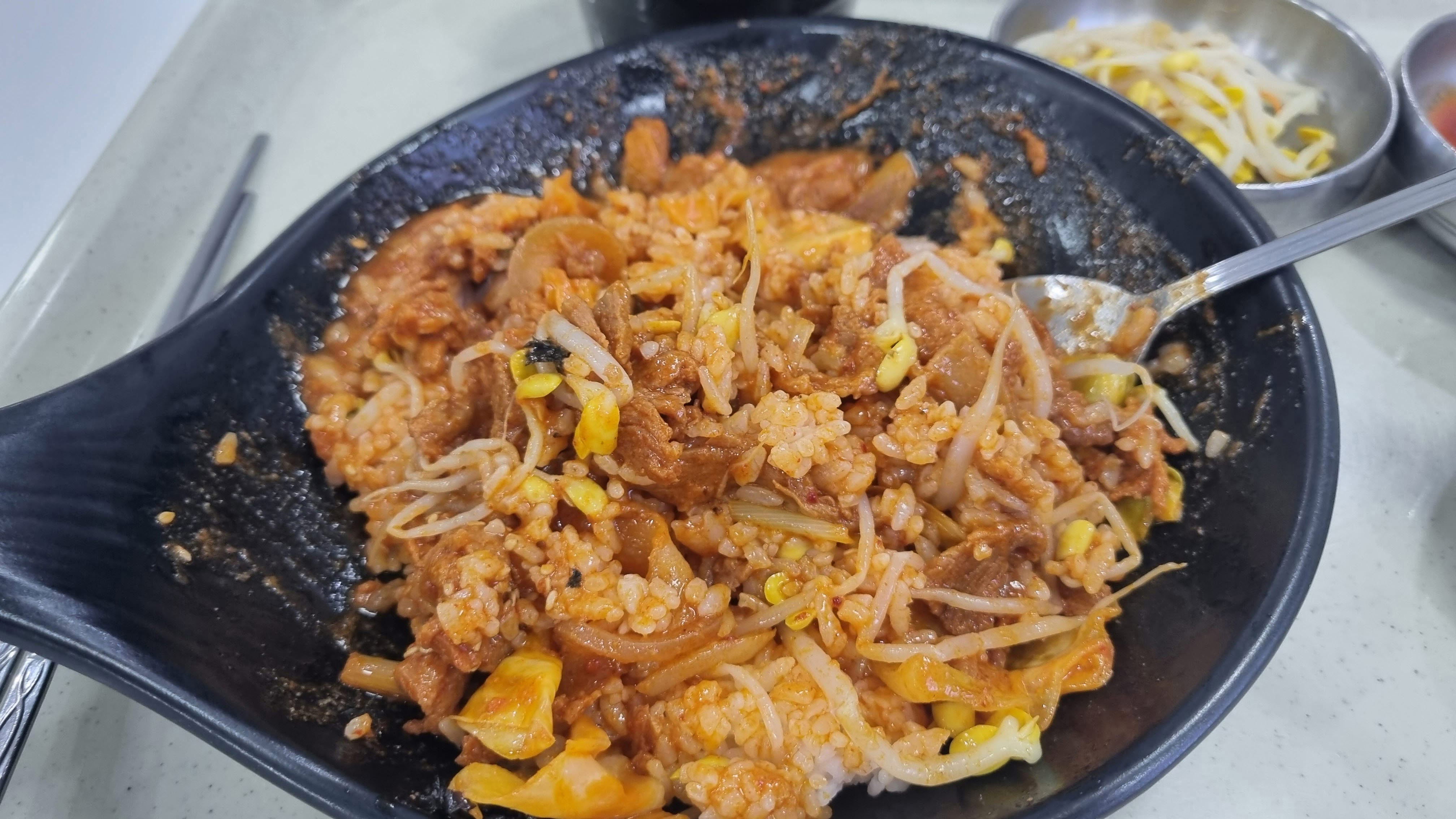 옛날식 프라이팬에 담겨 나왔는데 정말 괜찮았습니다. 양념이 된 고기에 공깃밥, 콩나물, 김가루등이 있어 비벼 드실 수 있도록 되어 있습니다.